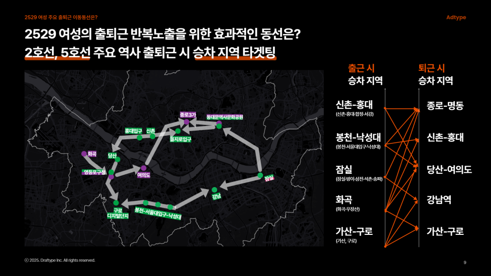 2529 여성의 주요 출퇴근 동선은 "신촌-홍대, 봉천-서울대-낙성대, 잠실, 화곡, 가산-구로" 에서 "종로-명동, 신촌-홍대, 당산-여의도, 강남역, 가산-구로" 지역을 잇는 대중교통 노선입니다. 서울 2호선 노선과 5호선 노선은 이들 지역을 효과적으로 이어주어, 2529 여성 대상 광고 매체로 추천드립니다.